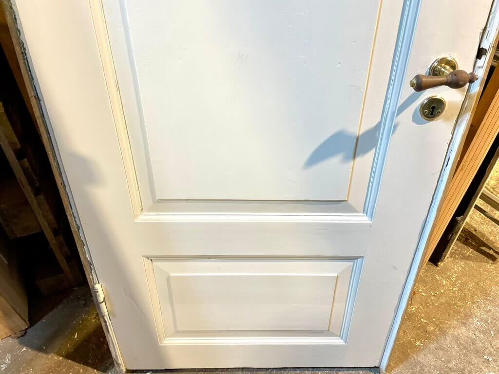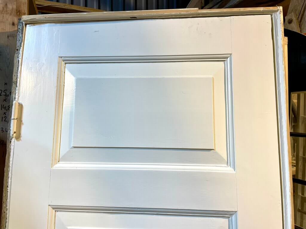 Original, lav bondehusdør med pæne profiler i felterne. Monteret med pæne greb i træ og messing. Fremstår pæn med almindelige brugsspor samt sundt træværk.