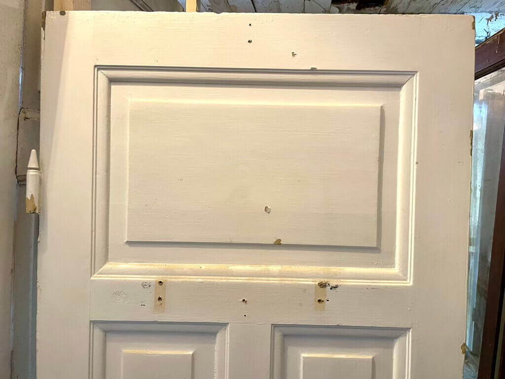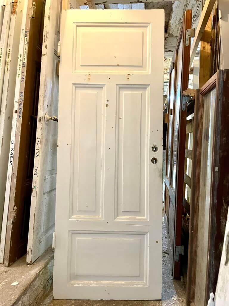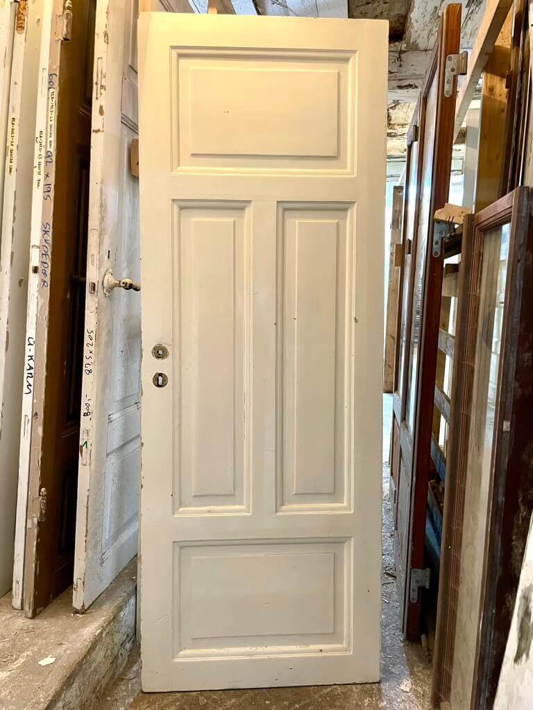 Klassisk, smal og lav fyldningsdør med fire felter med pæne profiler. Døren er oprindeligt venstrehængt og fremstår med sundt træværk og almindelige brugsspor. Uden karm, greb og låsekasse.