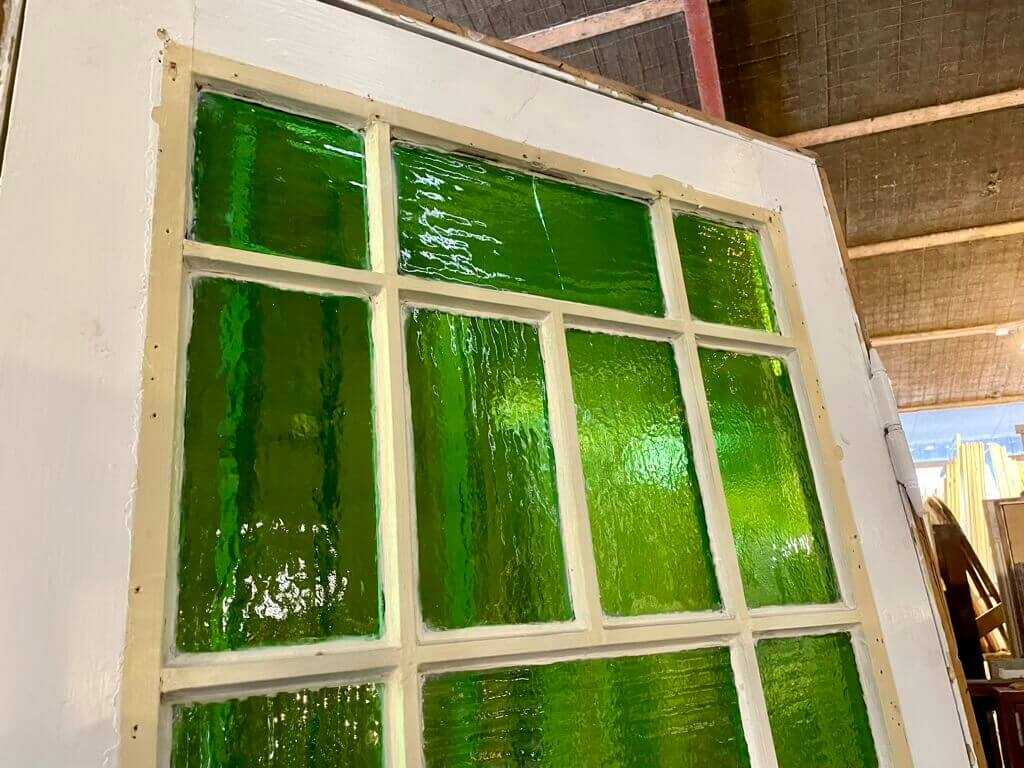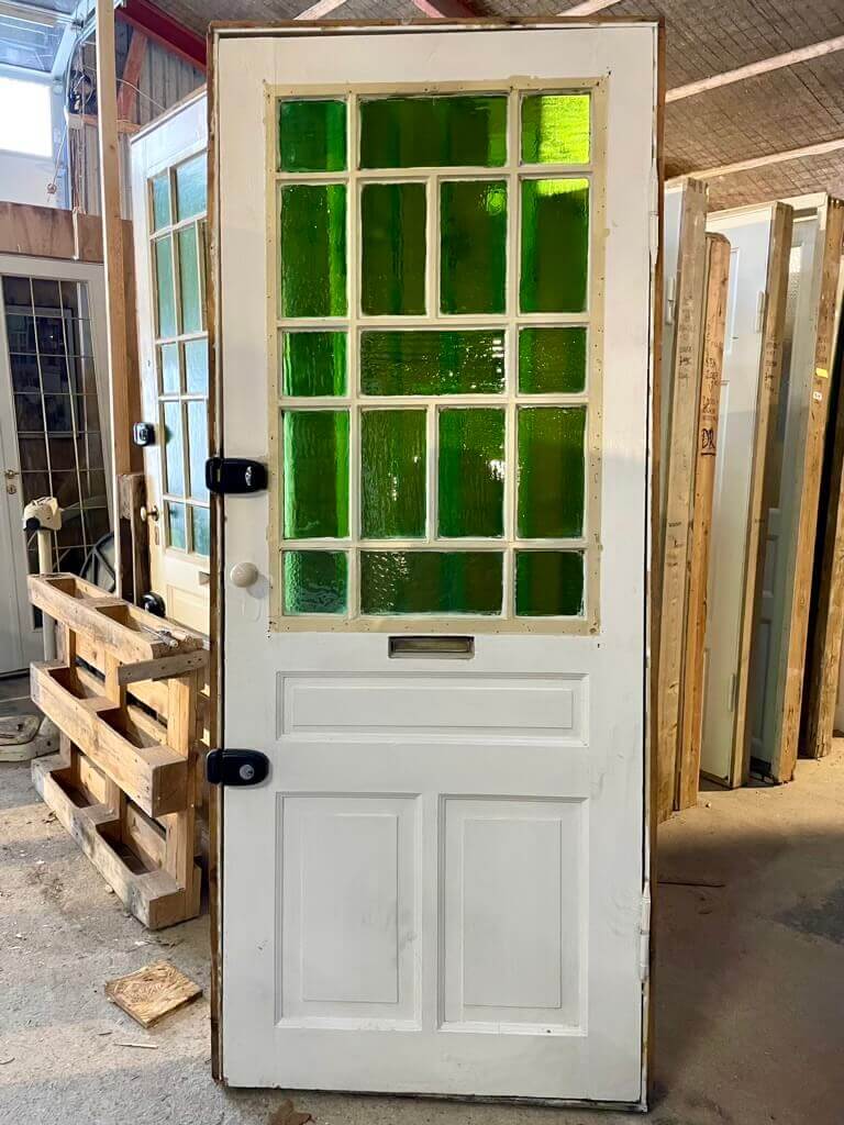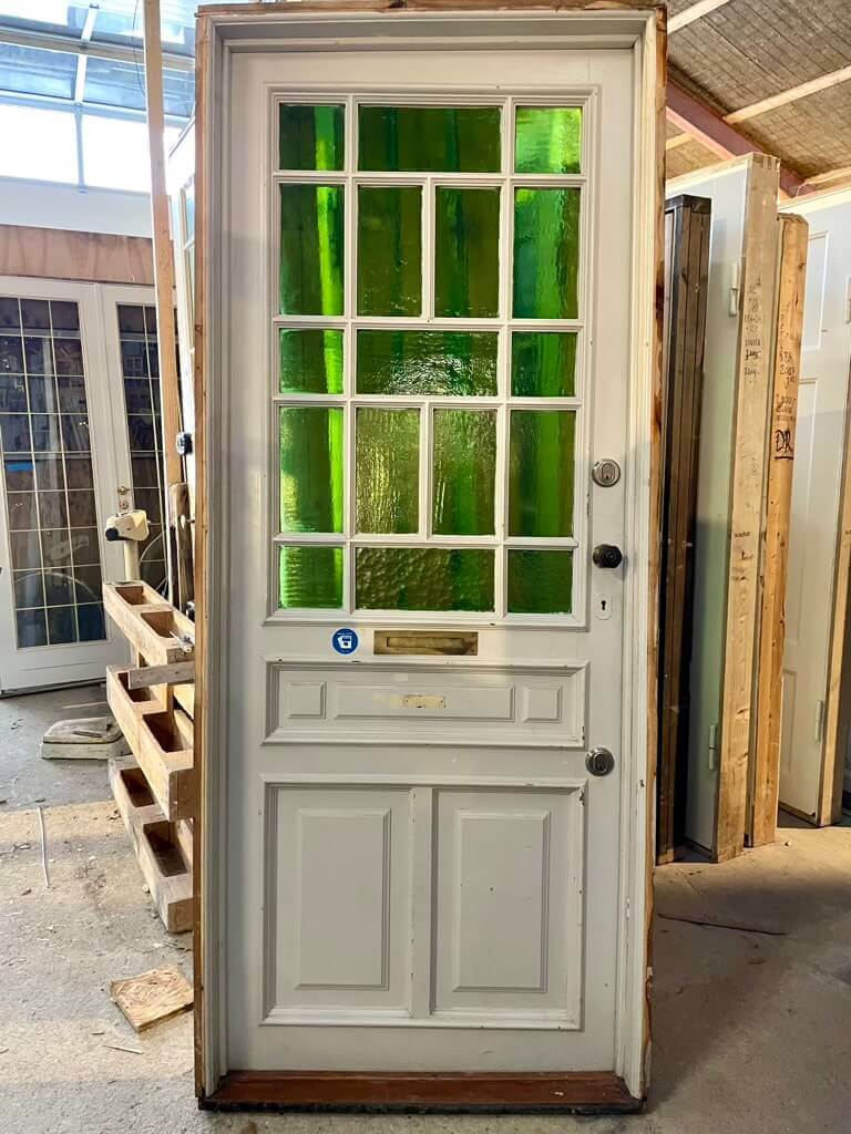 Original, smuk opgangsdør fra klassisk ejendom på Frederiksberg. Cirka 100 år gammel. Med fine fyldninger samt smukt glasparti af kittede ruder i grønt råglas (én rude med revne).