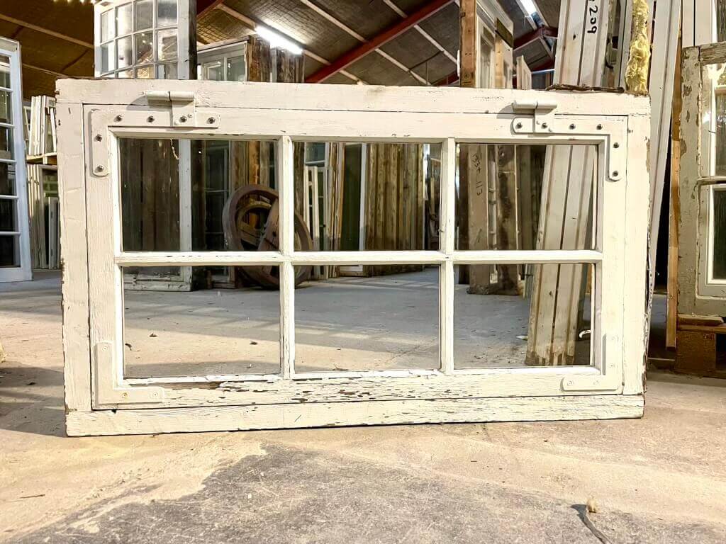 Klassisk, tophængt 6-ruders vindue med karm. Smalle sprosser og kittede ruder. Stammer fra villa i Hellerup, hvor der blev valgt udskiftning i stedet for energirenovering af vinduer.
