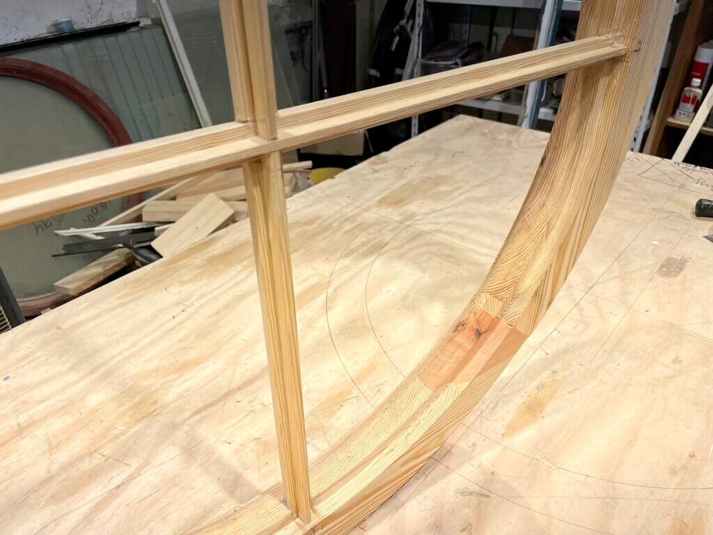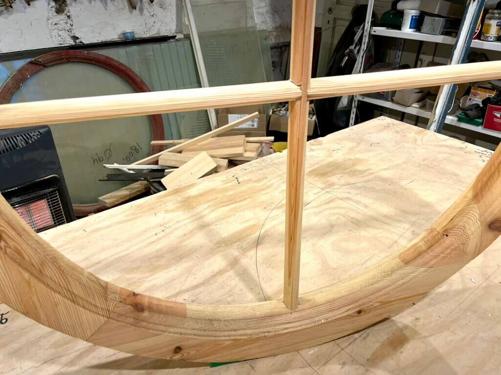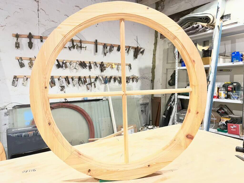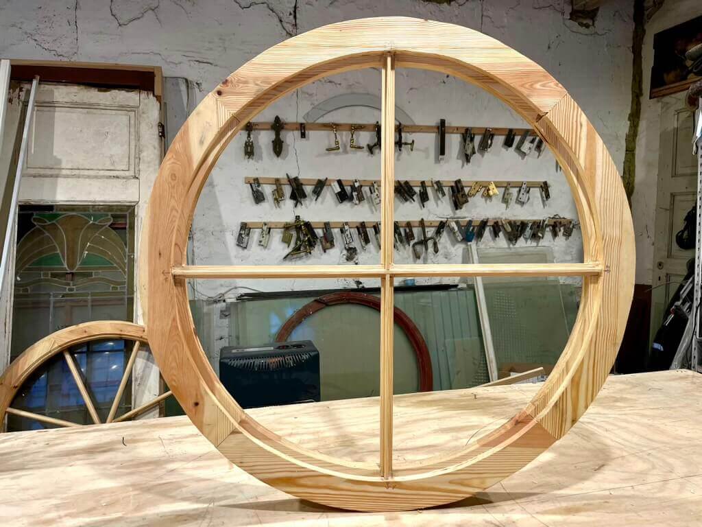 Klassisk, rundt vindue med smalle sprosser og fire rudefelter. Fremstår nylavet på eget værksted intet træ behandlet med linolie. Klar til maling og isætning af ruder.