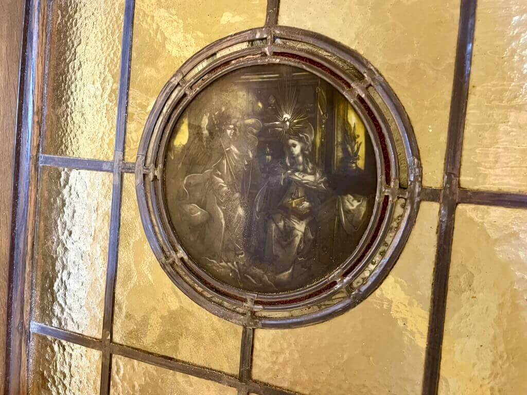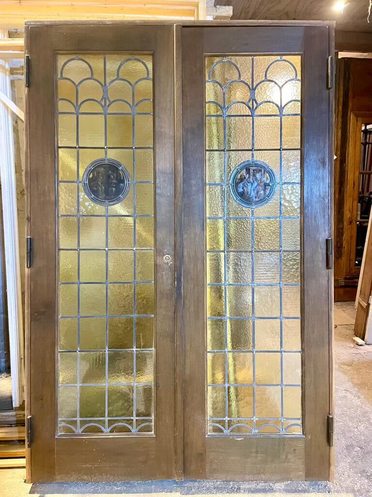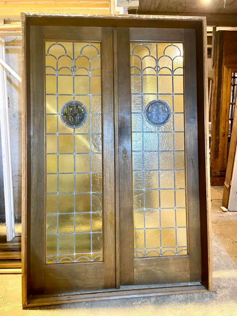 Sjælden dobbeltdør m. blyindfattede ruder og motiver 22.000,-