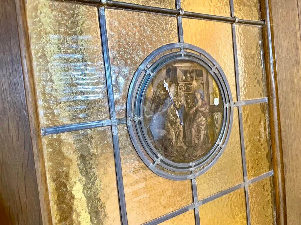 Smuk og yderst sjælden dobbeltdør med store glaspartier med blyindfattede ruder og motiver. Med original karm. Træværk fremstår pænt og sundt (formentlig egetræ). Tre ruder med revner - uden funktionel betydning.