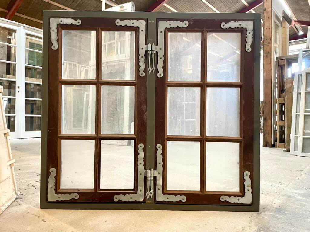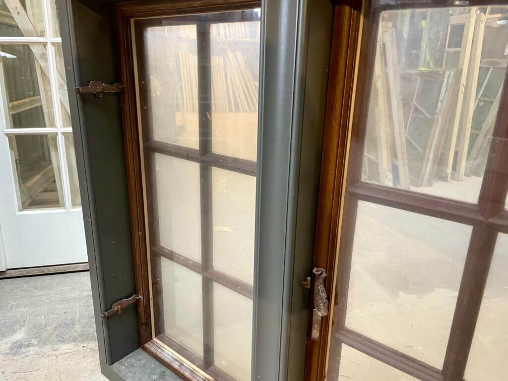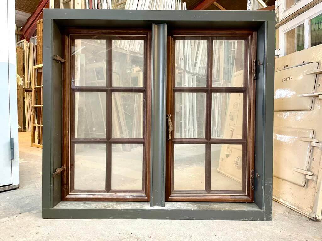 Ubrugt og aldrig monteret. Sjælden type 2-fags vindue med 6-ruders vinduesrammer, som er hængslet i midterposten. Med koblede rammer med enkeltlagsglas - dvs. to lag glas i alt.