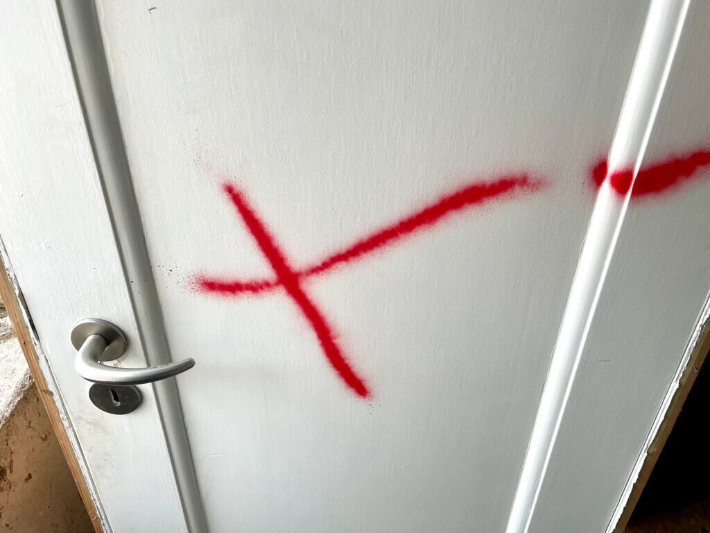Fremstår med sundt træværk. Maling er generelt fast - herunder også den graffiti, der følger med.
