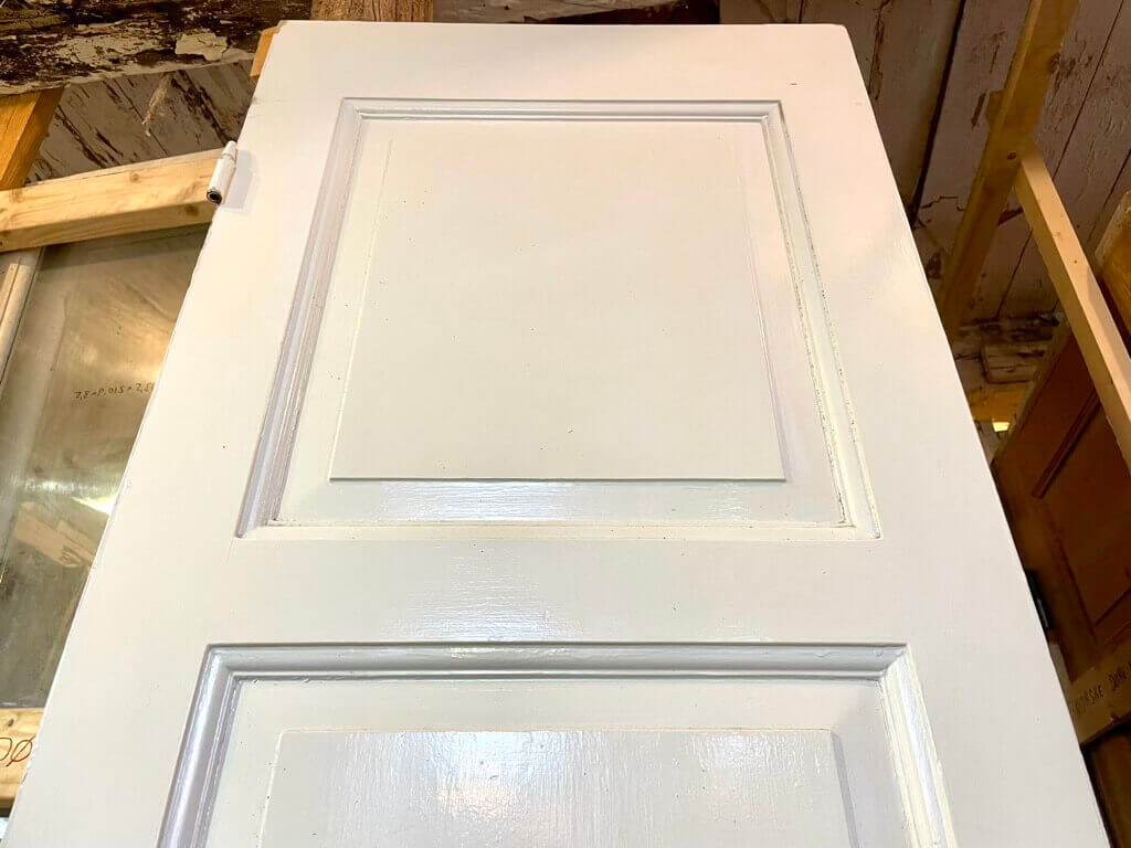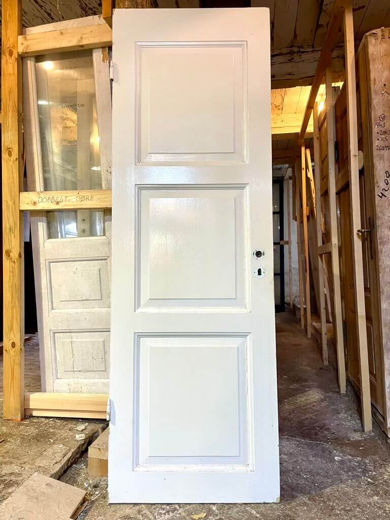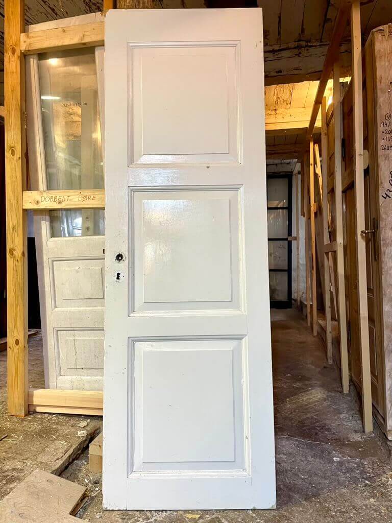 Original, smal fyldningsdør med tre felter med fine profiler. Oprindeligt venstrehængt. Sundt træværk samt almindelige brugsspor.