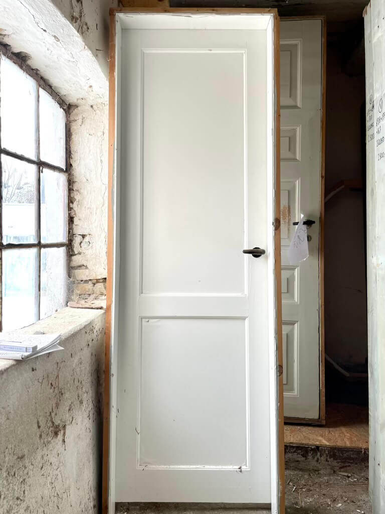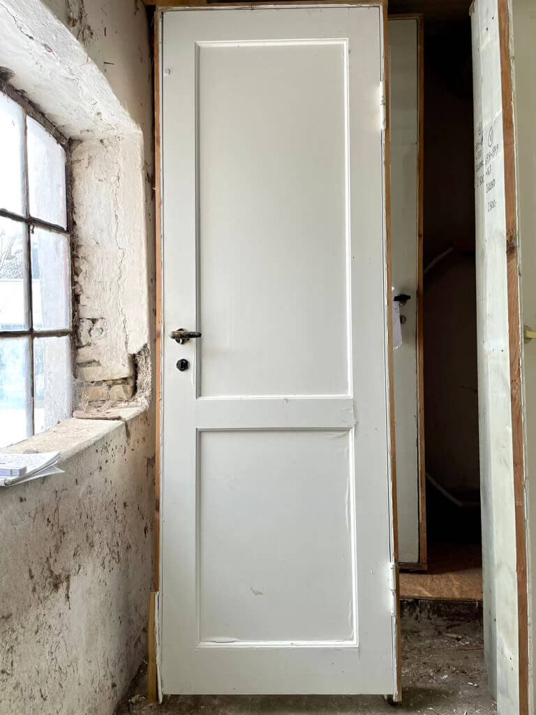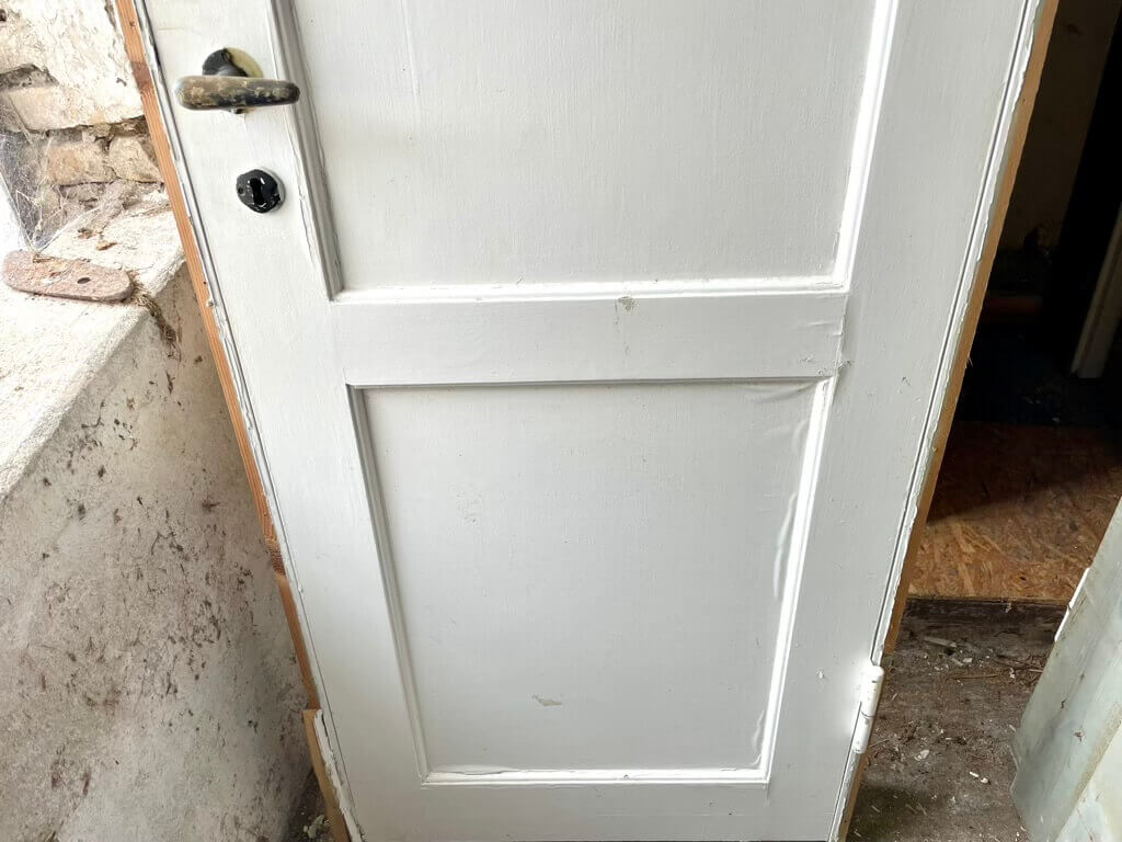 Smal, højrehængt fyldningsdør med to felter. Inkl. original karm og greb (forskellige greb i det oprindelige parti).