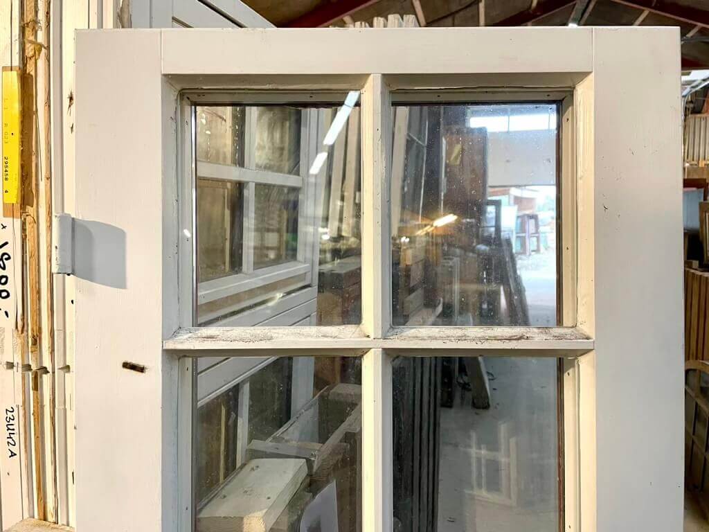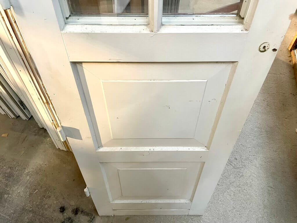 Fin, enkelt terrassedør med 6-ruders vinduesparti og fyldninger. Kittede, småsprossede ruder samt indvendig koblet dør med to-lags termorude. Uden karm. Fremstår i god stand med fast kit og fast maling samt sundt træværk.