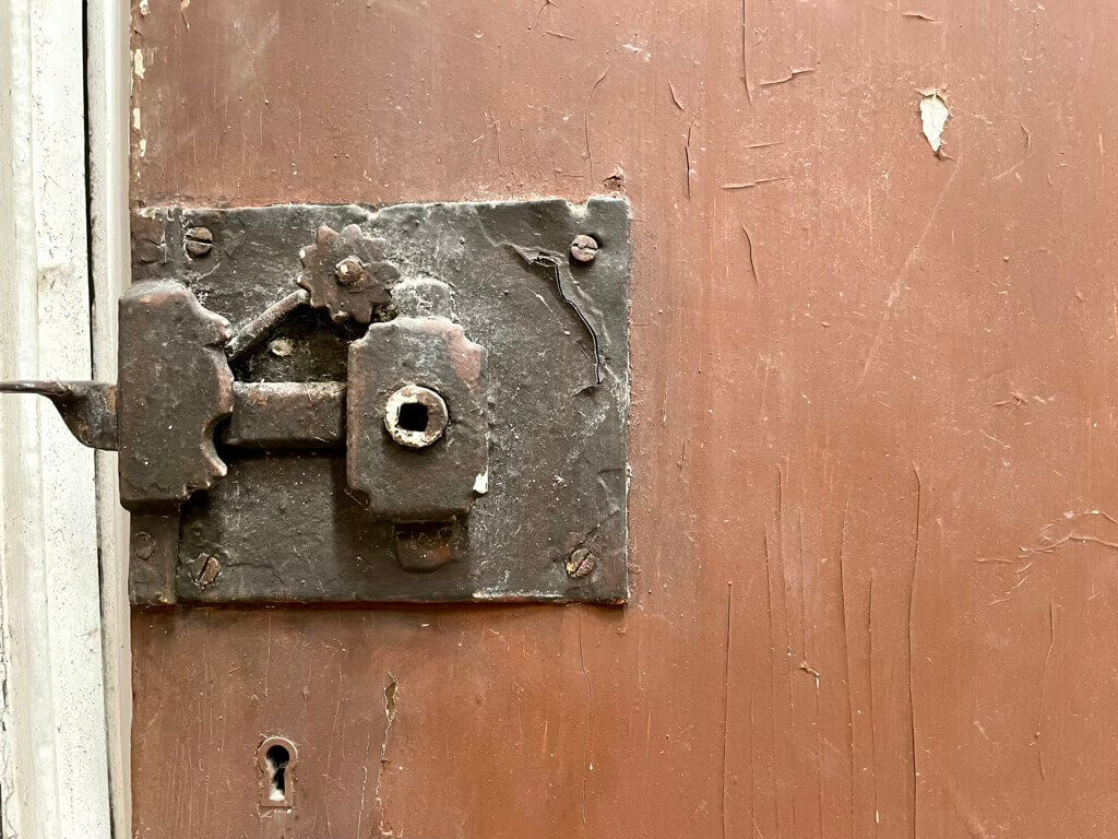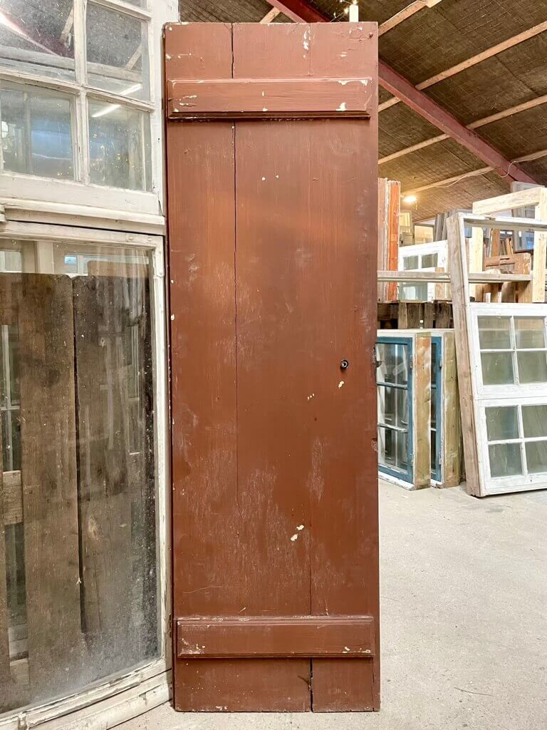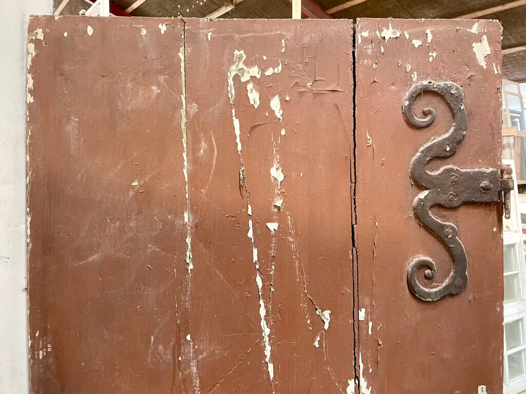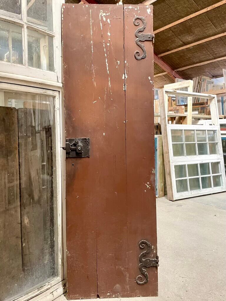 Original, gammel stalddør af tre planker. Med smukke bukkehorns-hængsler samt originalt og fungerende låsetøj. Fremstår med sundt træværk, afskallende maling og alderssvarende slitage.