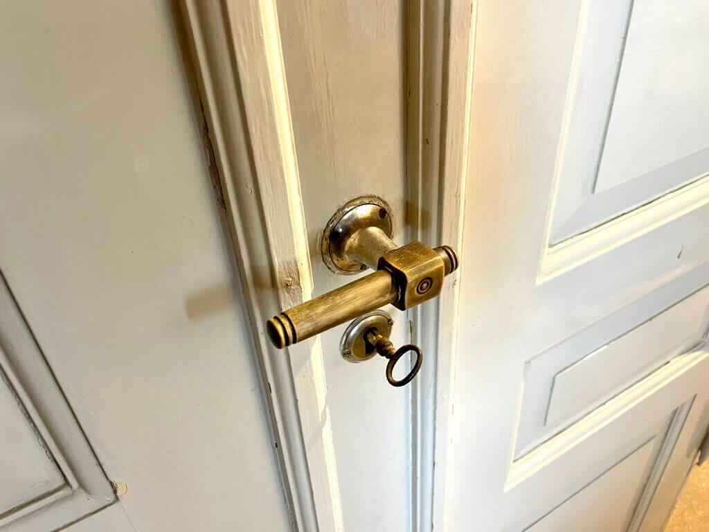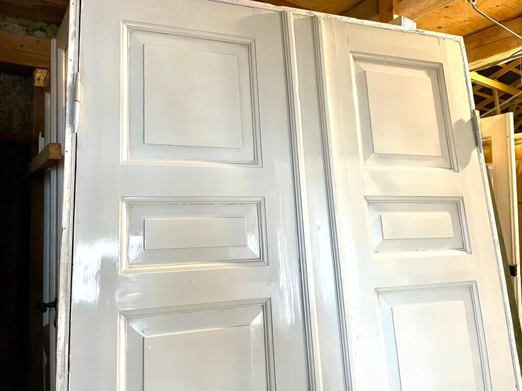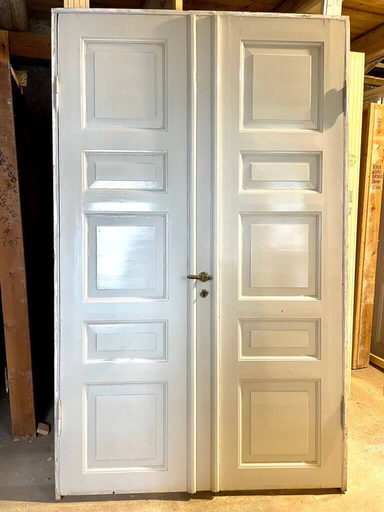 Smuk, dobbelt fløjdør med karm. Monteret med fine spidsgreb i træ på blanke trompethalse og med tilhørende nøgleskilte. I øvrigt inkl. nøgle. Karmen er original. Uden bundstykke.