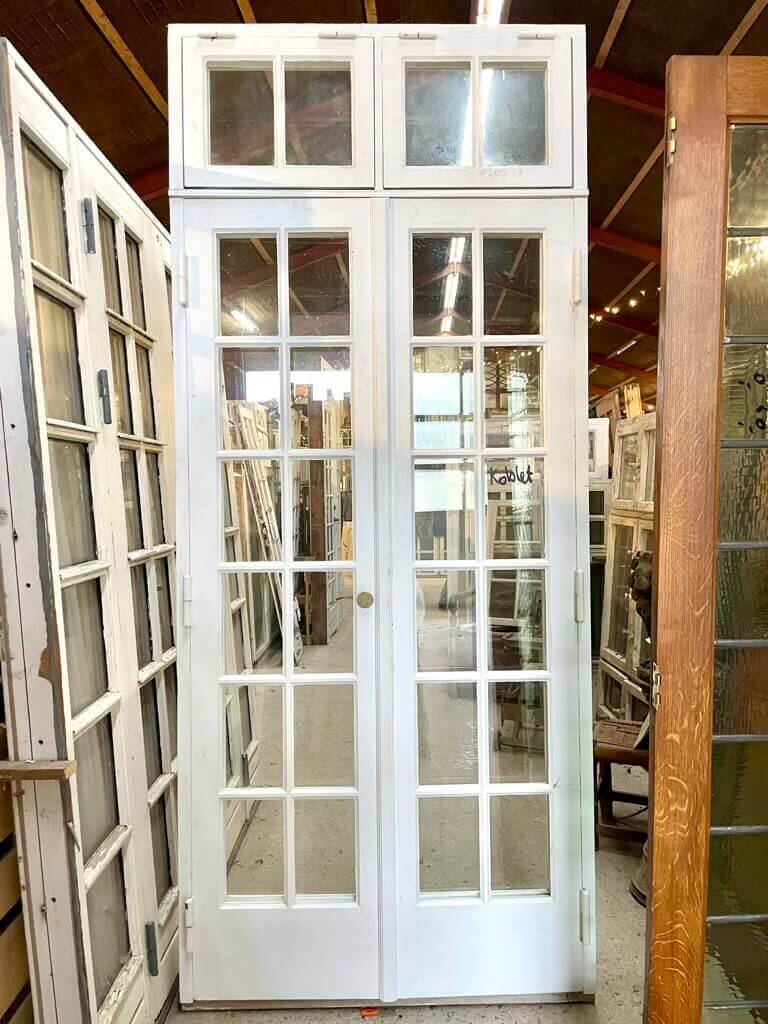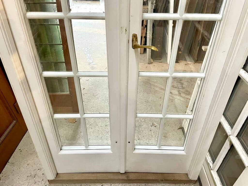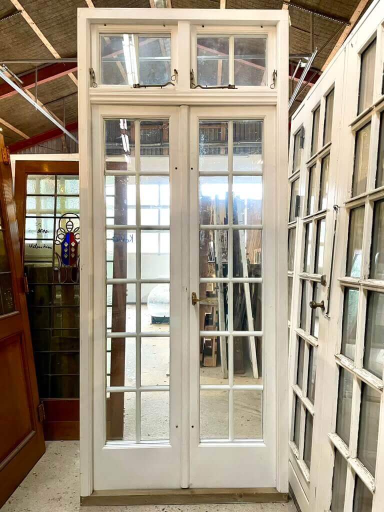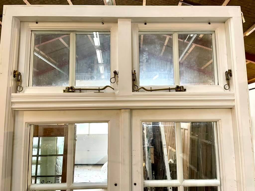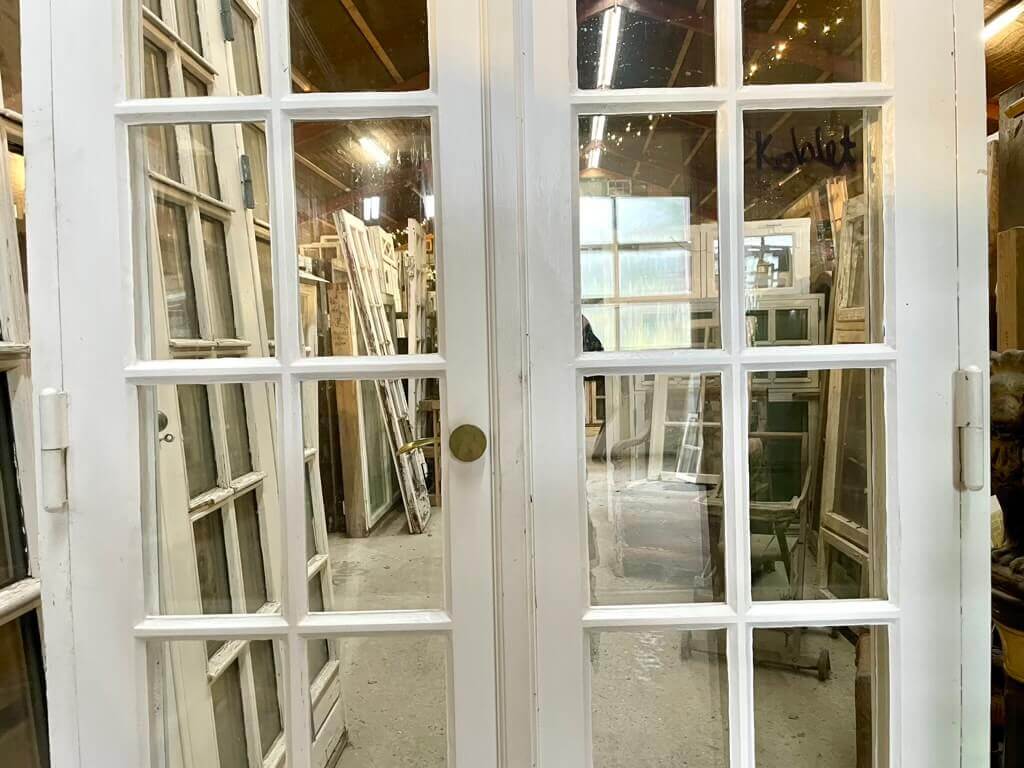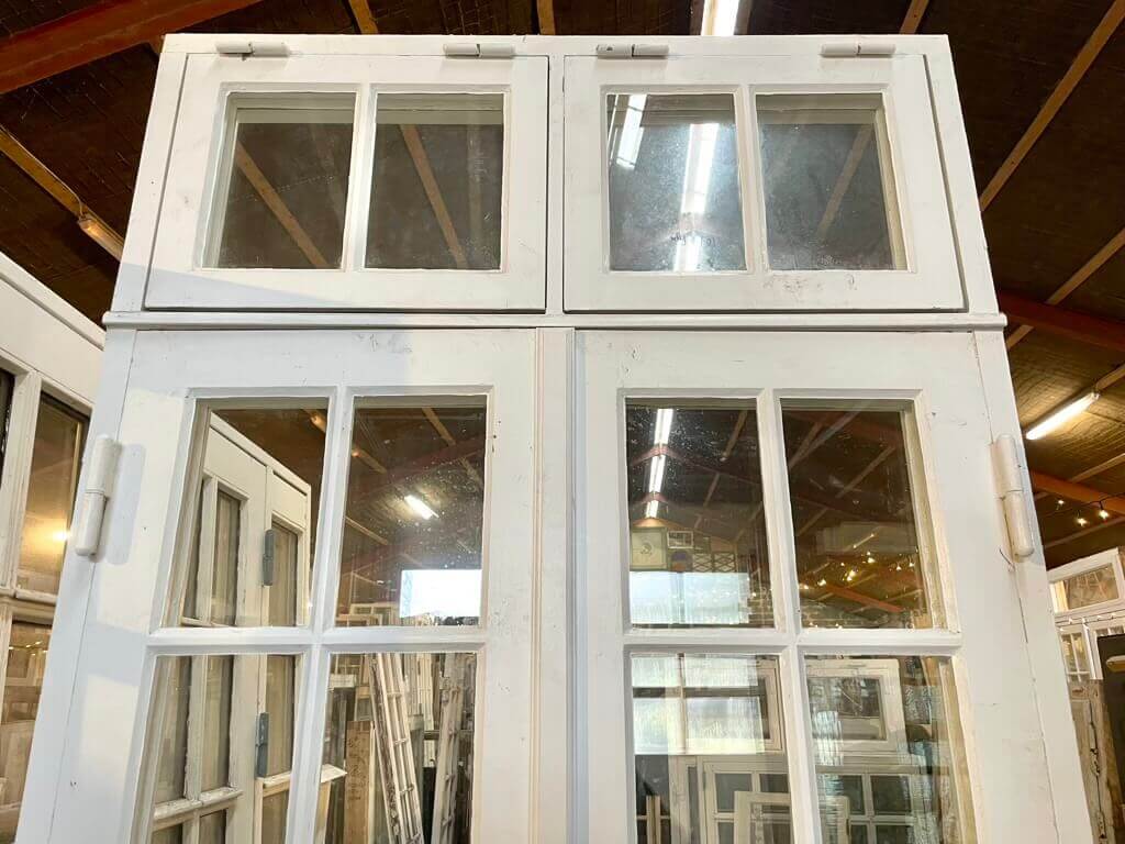 Meget smuk og klassisk dobbelt terrassedør med franske døre og koblede rammer (også på vinduerne øverst). Med smalle sprosser og kittede ruder. Monteret med fine messinggreb. Inkl. original karm og bundstykke i hårdt træ.