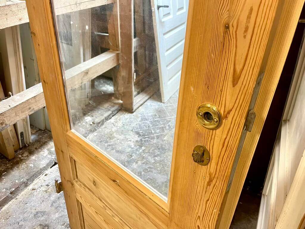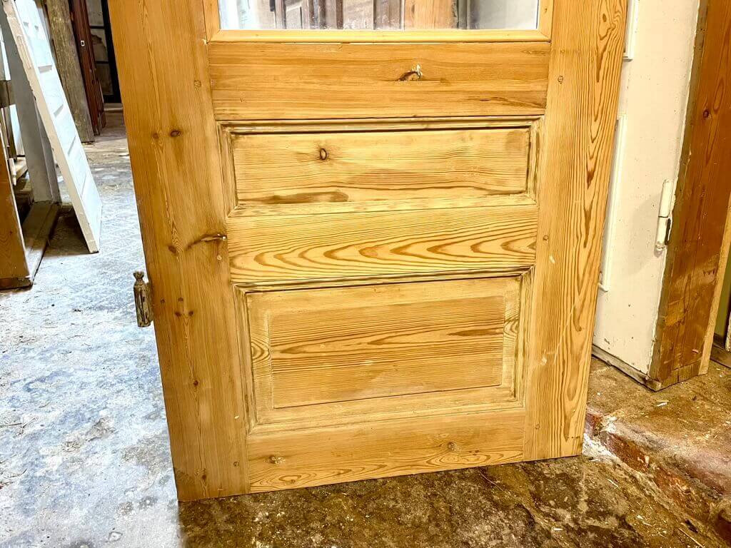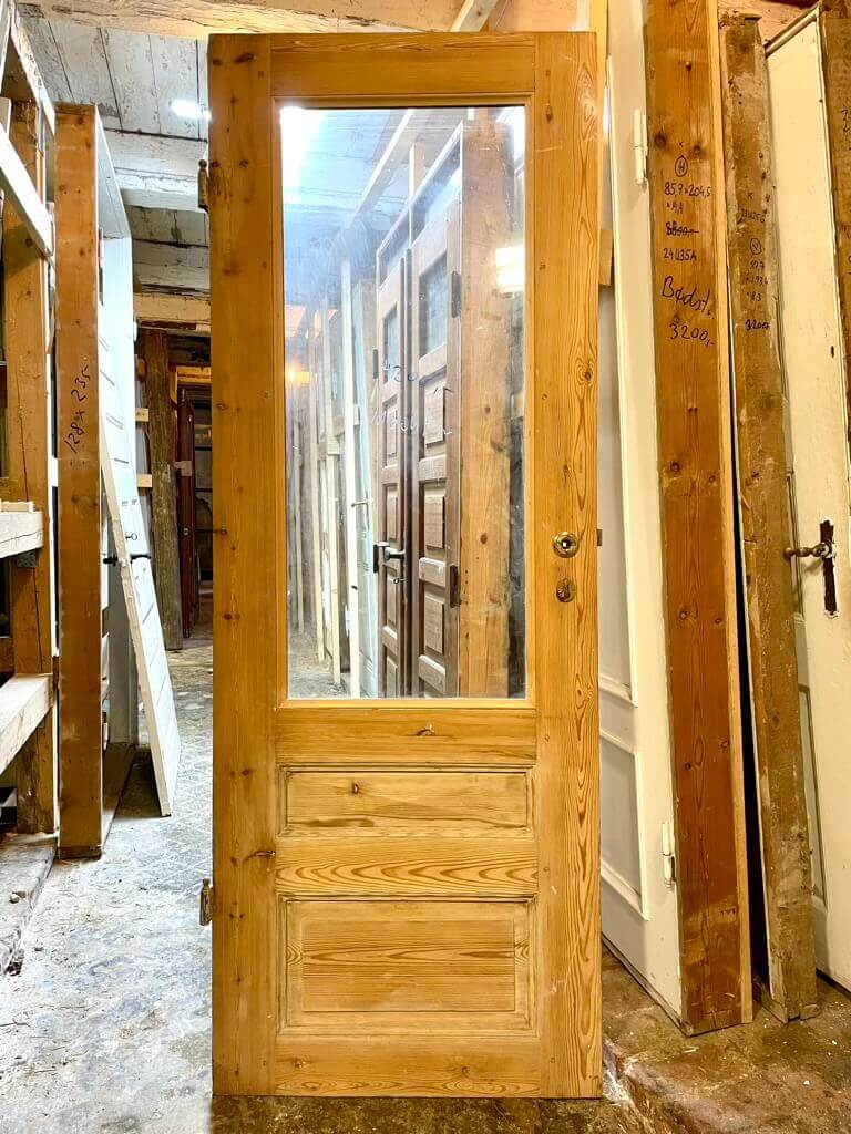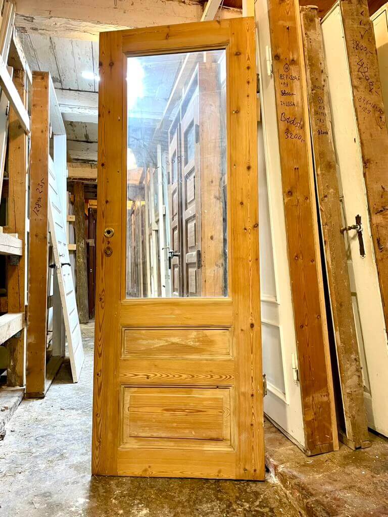 Smuk og sjælden fyldningsdør med stort rudeparti. Med rosetter og nøgleskilte i messing, dog uden greb. Fremstår afsyret uden maling, sundt træværk og få overfladiske brugsspor. Originale hamborghængsler med knopper (uden stabler). Oprindeligt venstrehængt. Døren er uden karm.