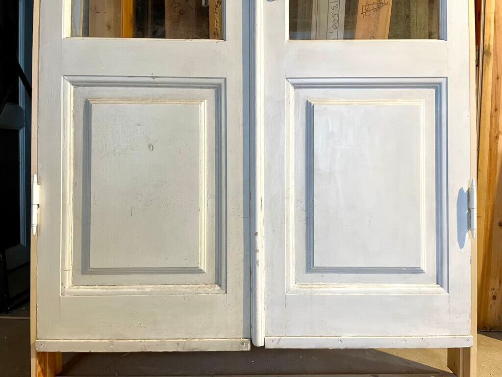 Smuk, original, dobbelt glasdør med høje vinduespartier samt pæne fyldninger nederst. Fremstår med sundt træværk samt let afskallende maling og kit, der skal efterses.
