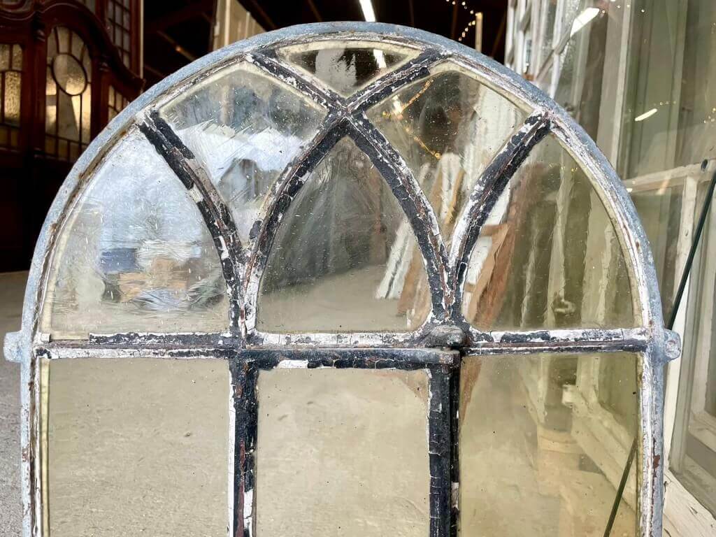 Smukt støbejernsvindue i god stand alderen tager i betragtning. Med smukke ruder i originalt, blæst glas med gule nuancer. Fremstår med overfladisk rust, lidt løs eller manglende kit og behov for ny maling. Med åbnende rude i midten. Oprindeligt flere på lager; kan have en rude itu.