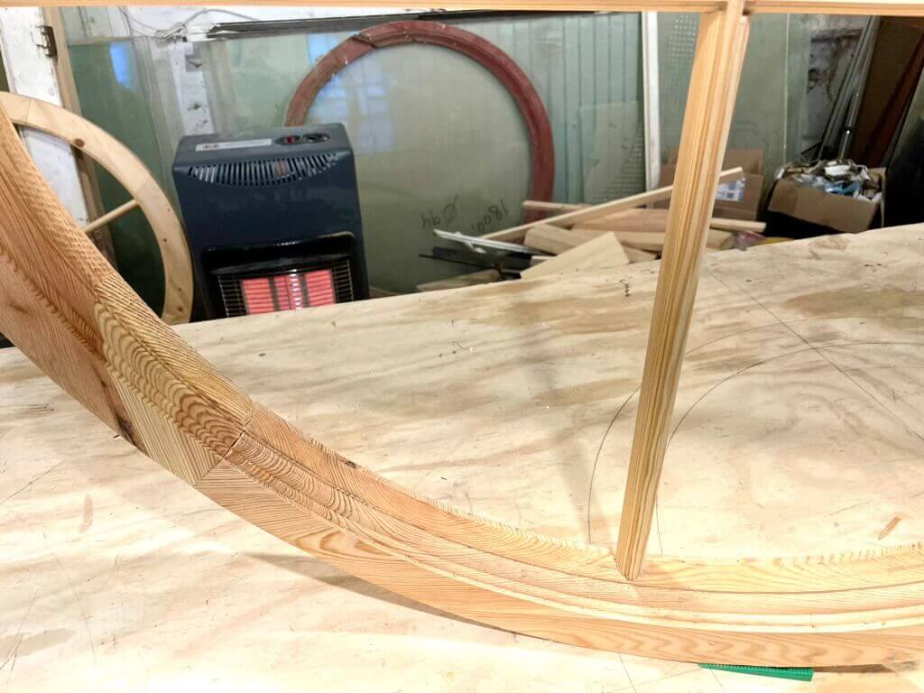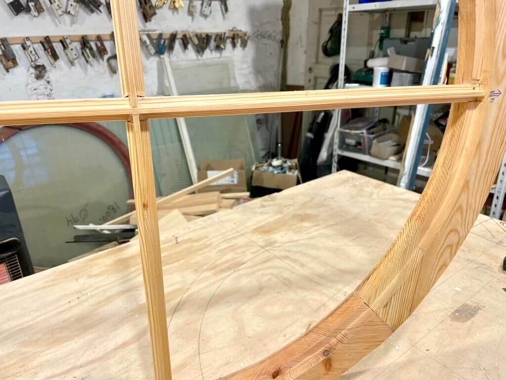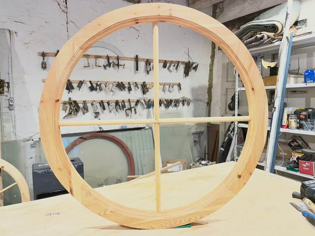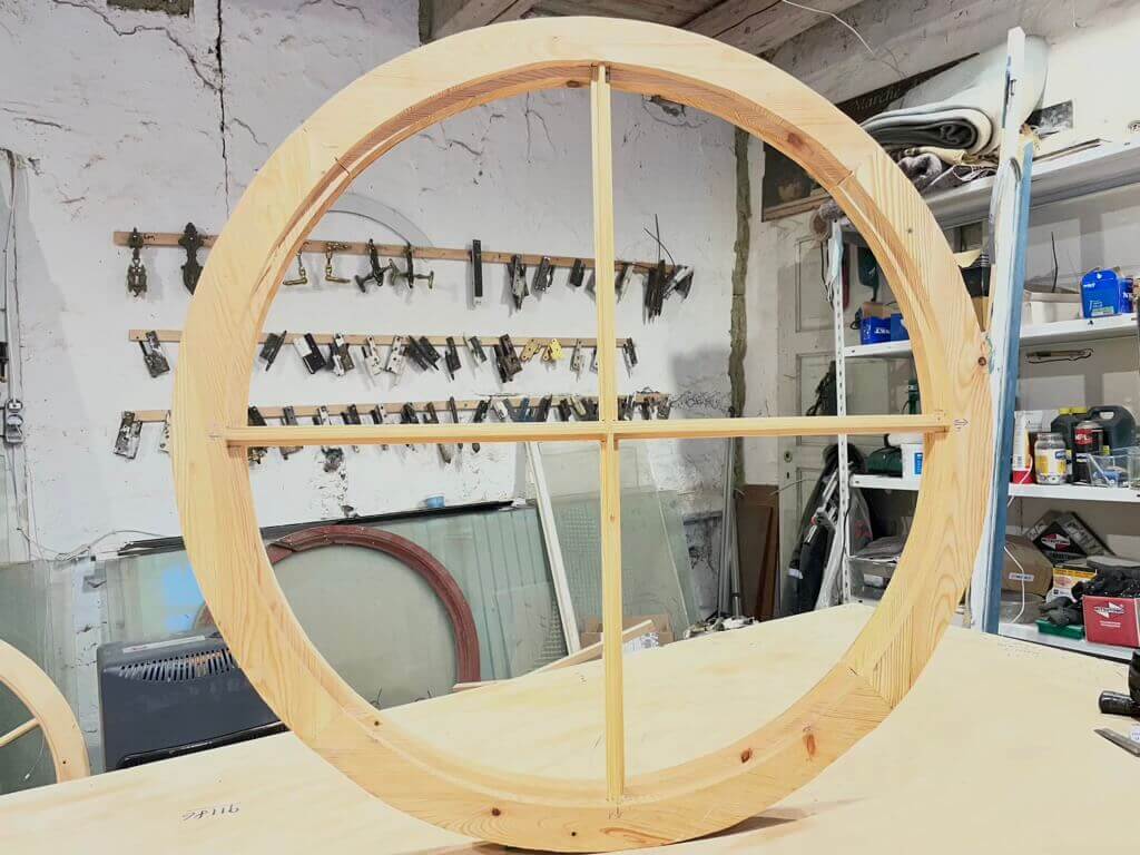 Nylavet, rundt vindue med klassiske, smalle sprosser og fire rudefelter. Behandlet med linolie og er klar til maling og isætning af ruder.