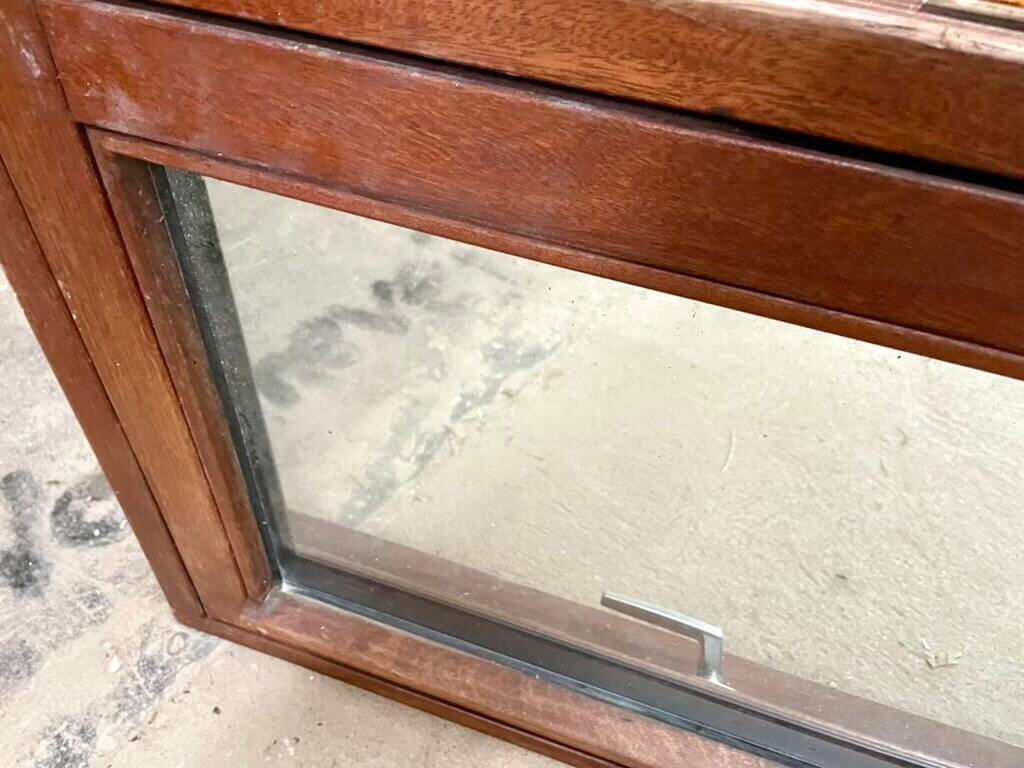 Tophængt, aflangt teaktræsvindue m. termorude 1.600,-