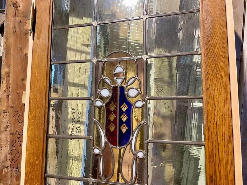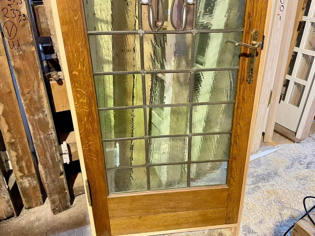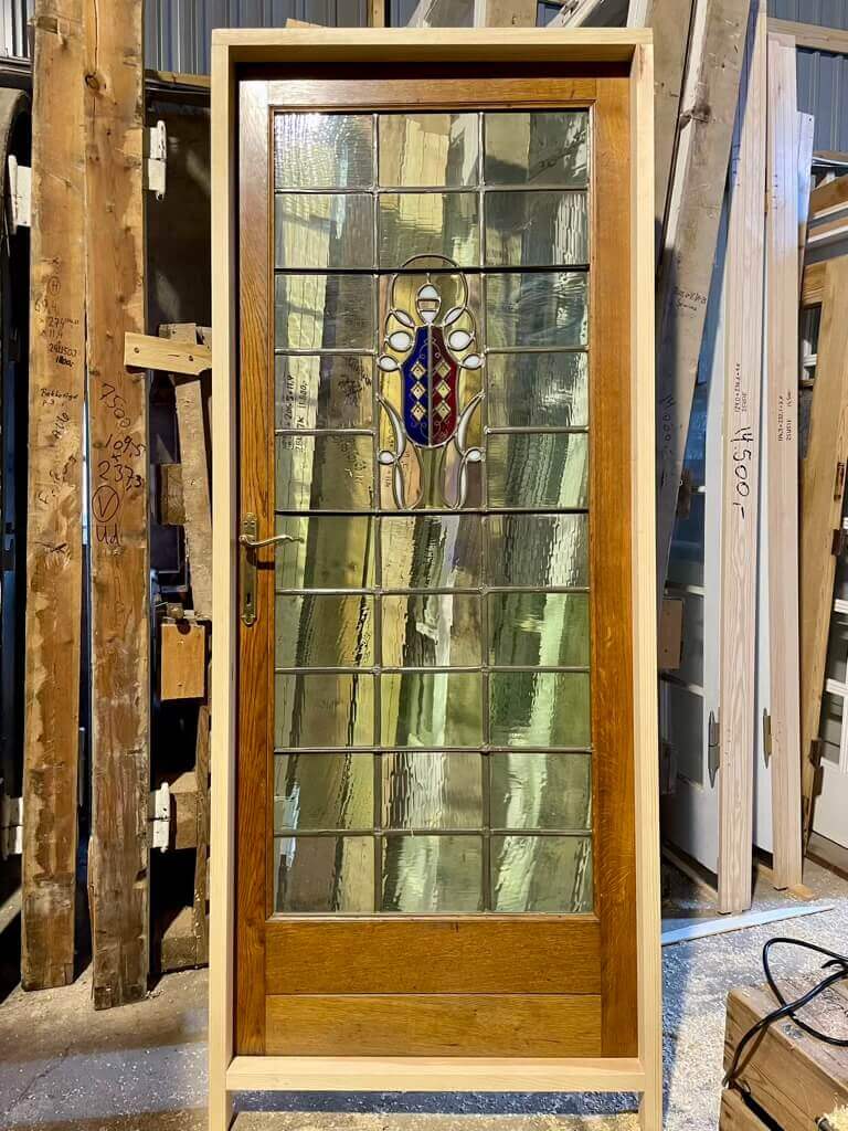 Sjælden og unik enkeltdør med stort glasparti af blyindfattede ruder med smukt motiv i midten.