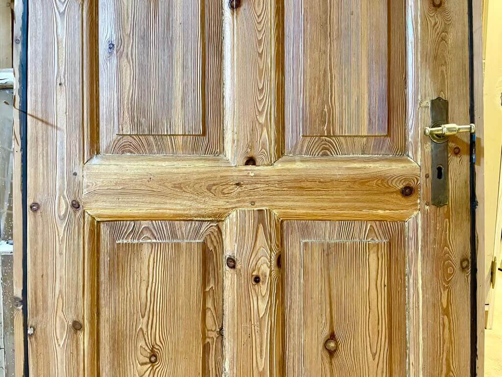 Original, tidstypisk venstrehængt og lav Dannebrogsdør med karm. Inkl. karm og originale krydsgreb i messing.