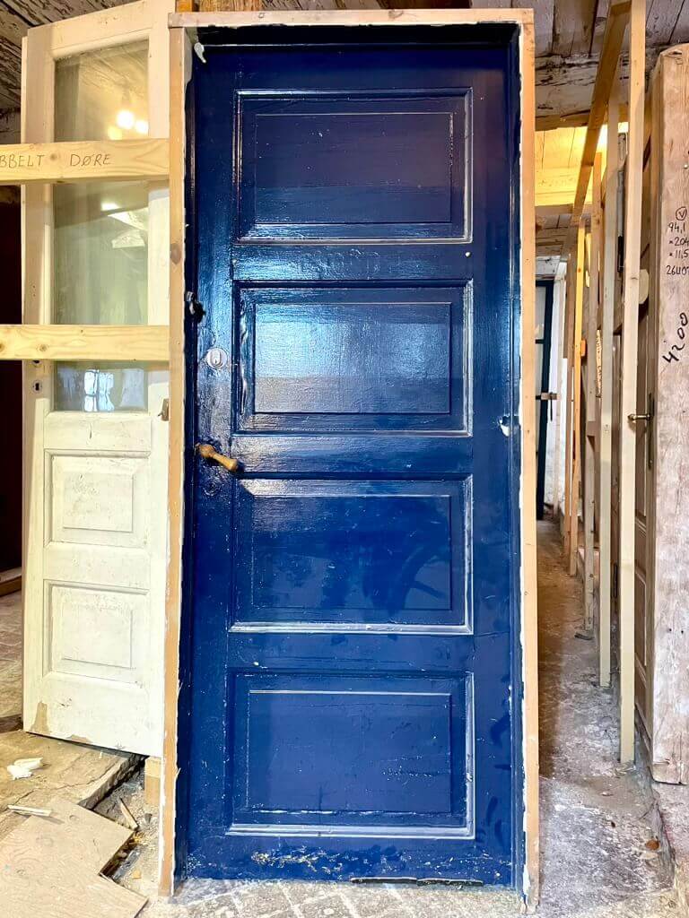 Hidsigt malet venstrehængt, original opgangsdør med karm og klassisk Københavner-greb. Med pæne hamborghængsler og fire felter. Trompethalse og nøgleskilte er også klassiske, men pt. dækket af maling.